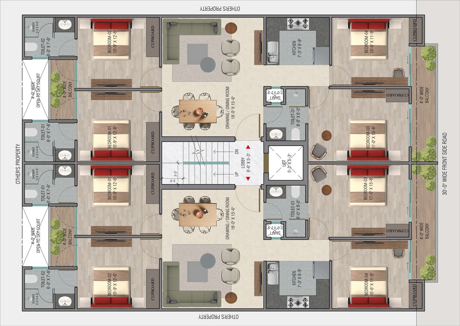 The project features thoughtfully planned 4BHK layouts with clearly defined zones for living, dining and private areas. The floor plan ensures maximum usability of space while maintaining smooth internal circulation between rooms.